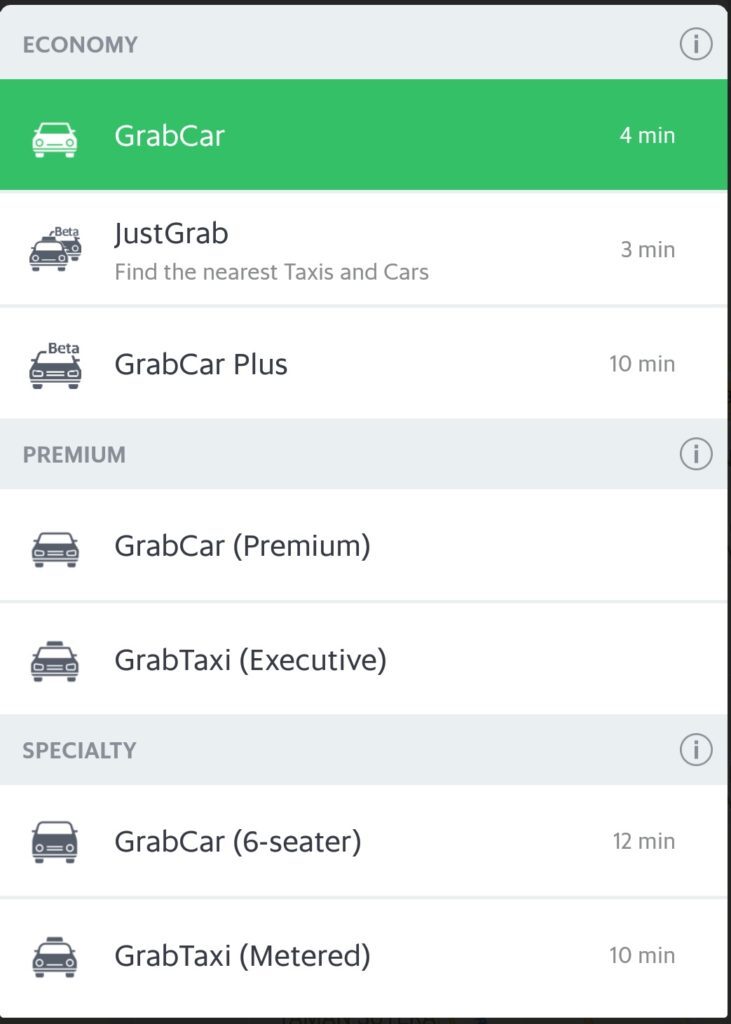 차종은 그랩카(일반자가용), 그랩택시, 밴, 고급차, SUV 등